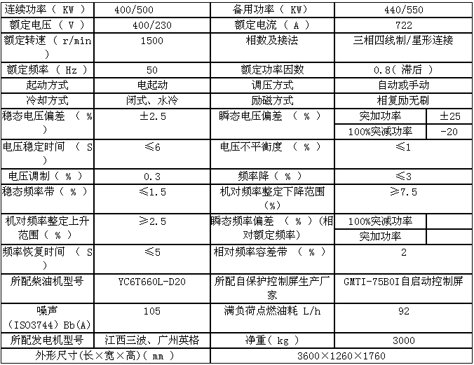 400KW柴油發(fā)電機(jī)組主要技術(shù)參數(shù)